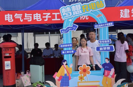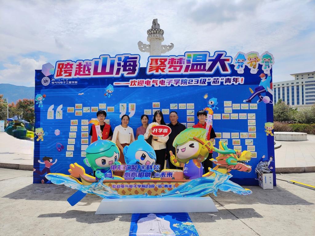 温州大学电气与电子工程学院采用“以‘芯’迎新,薪火相传”的理念,融合学院专业特色和第19届杭州亚运会主题,将科技风和运动风相结合,迎接305名本科生、79名研究生的到来,寓意着“点亮科技,爱达未来”。