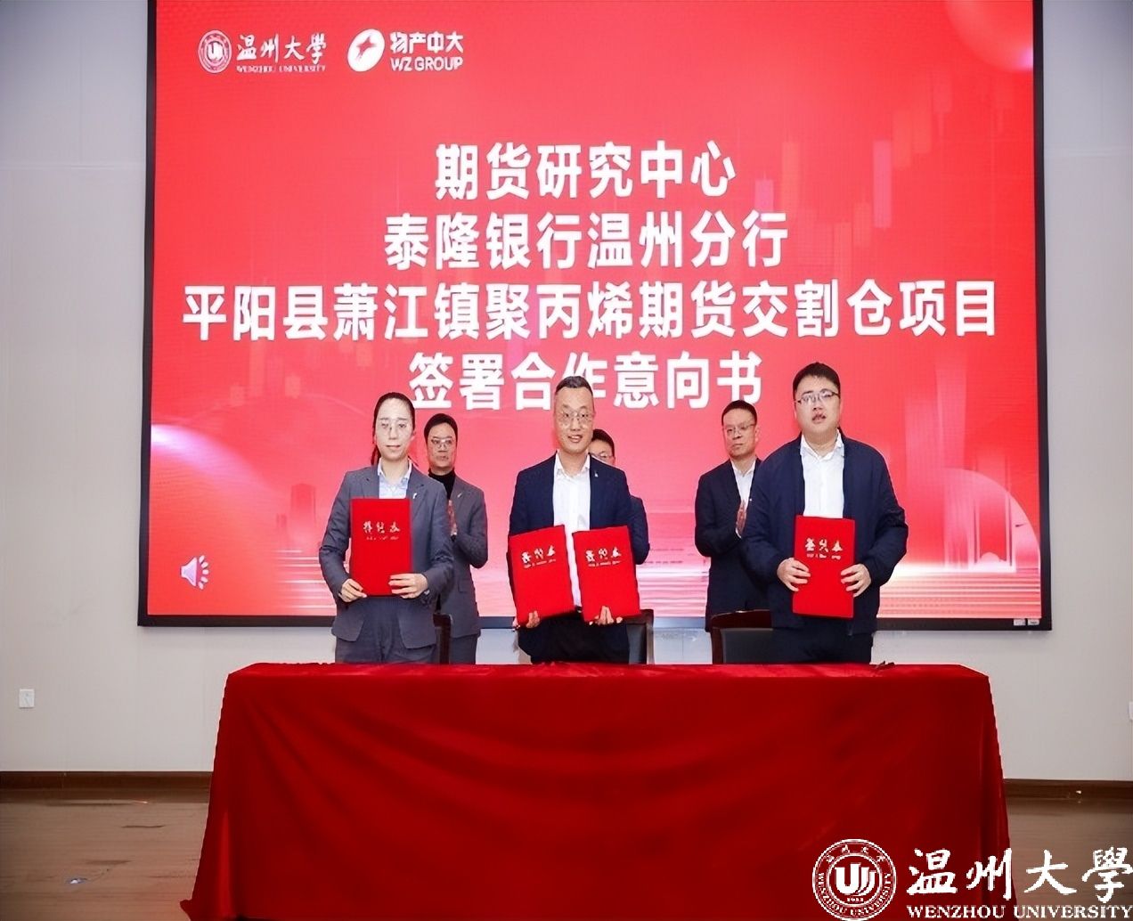仪式上,双方共同为研究中心揭牌,并与泰隆银行温州分行、平阳县萧江镇聚丙烯期货交割仓签署合作意向书。同时,物产中大期货温州分公司被授予“温州大学商学院校外实践教育基地”,双方党支部签署党建共建协议,进一步强化组织协同。研究中心还聘请全球衍生品交易大赛冠军谭伟鸿、物产中大期货研究院院长吕洁等专家担任顾问,为科研与实践提供智力支持。