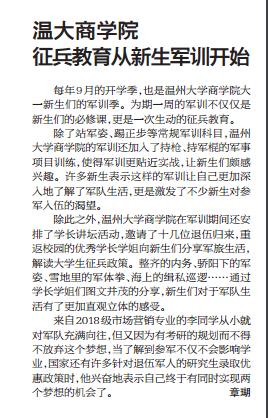 每年9月的开学季,也是温州大学商学院大一新生们的军训季。为期一周的军训不仅仅是新生们的必修课,更是一次生动的征兵教育。