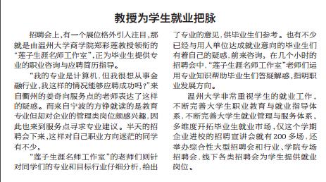 招聘会上,有一个展位格外引人注目,那 就是由温州大学商学院郑彩莲教授领衔的 “莲子生涯名师工作室”,正为毕业生提供专 业的职业咨询与应聘简历指导。