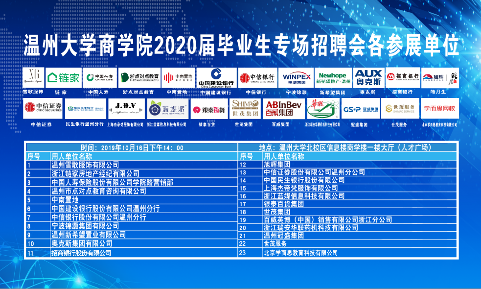 为搭建有效的就业平台和渠道,促进应届毕业生顺利就业,经学院研究决定于2019年10月16日下午13:30在商学院一楼大厅(人才广场)举办“温州大学商学院2020届毕业生专场招聘会暨人才广场揭牌仪式”,现将招聘会等有关事宜通知如下: