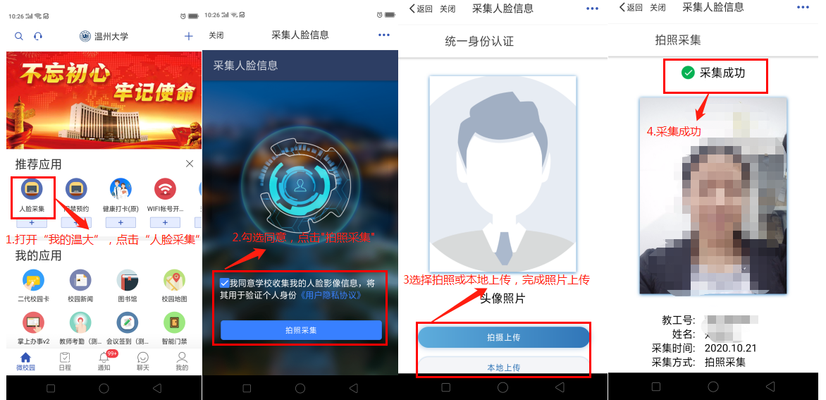 打开“我的温大”APP,在“推荐应用”中点击“人脸采集”微应用,点击“拍照上传”或“本地上传”按钮,进行人脸采集工作。