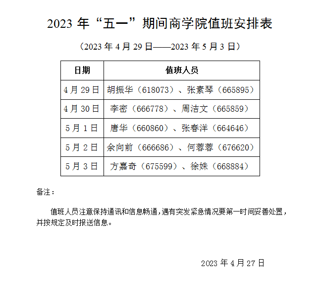 2023年“五一”期间商学院值班安排表