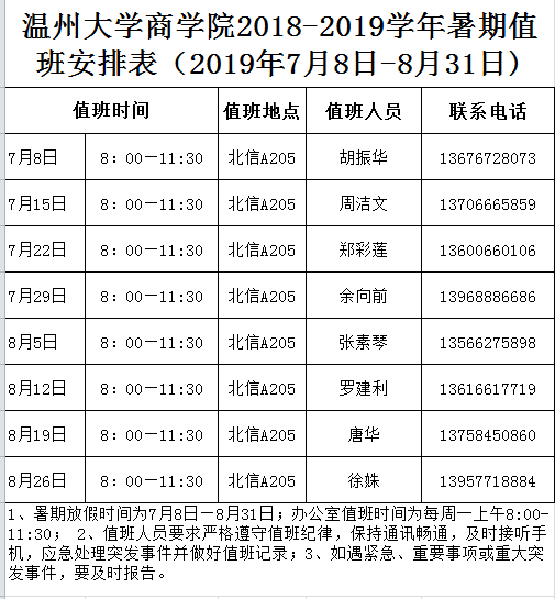 温州大学商学院2018-2019学年暑期值班安排表(2019年7月8日-8月31日)