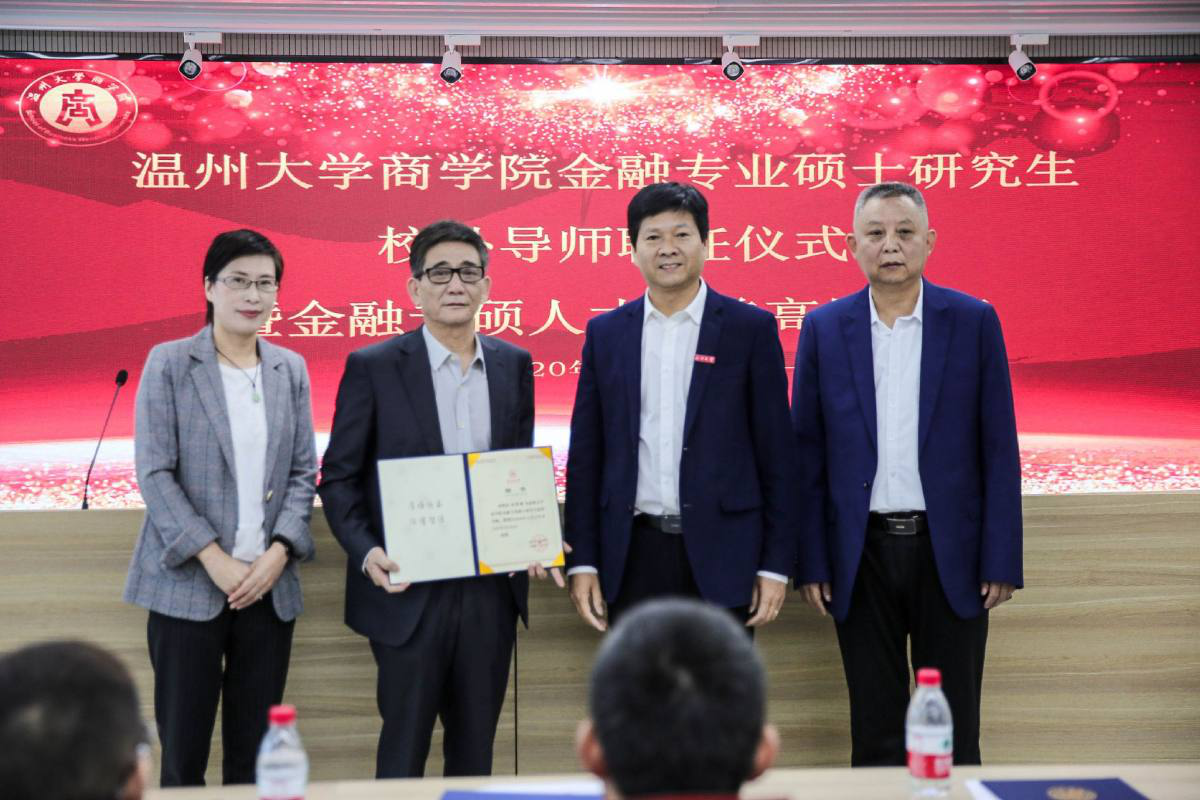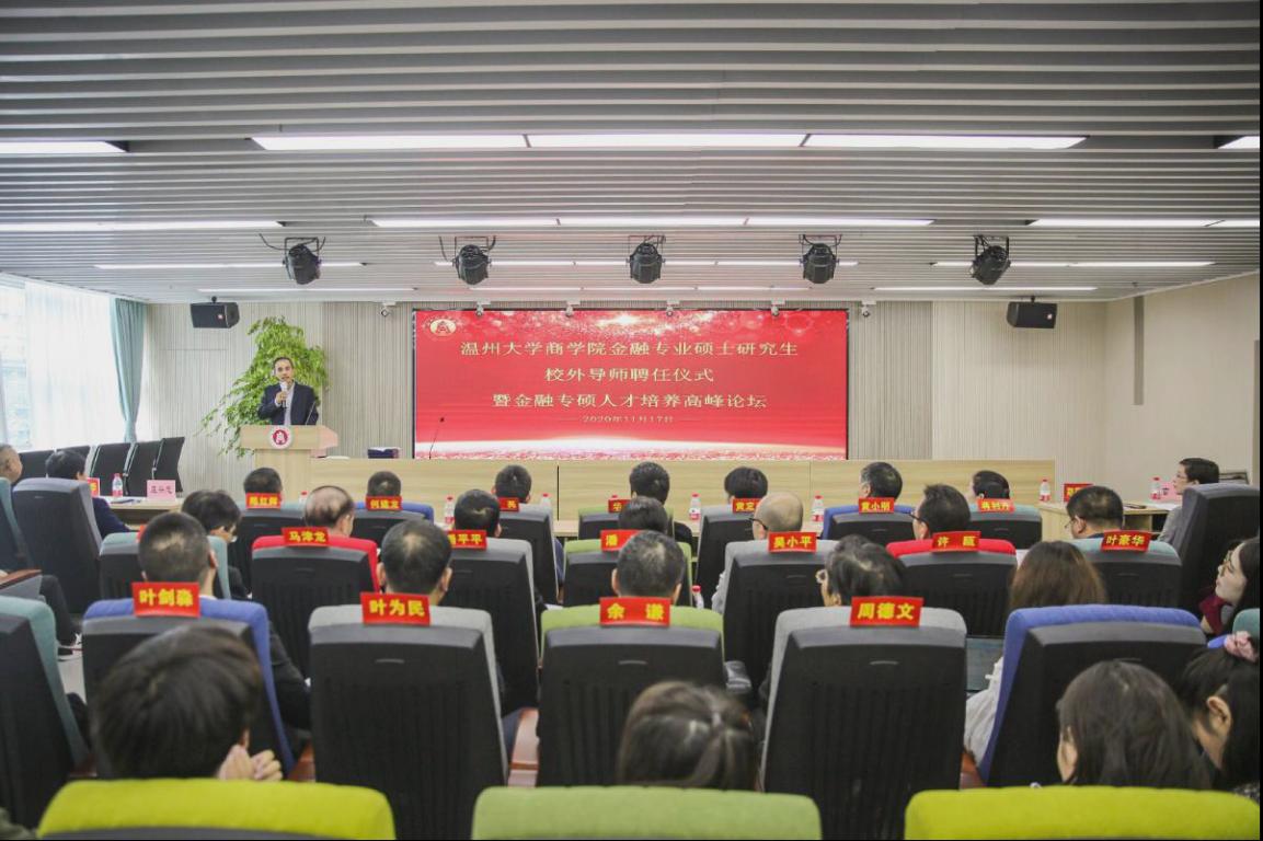 11月17日上午在商学院A226会议室,召开了商学院2020届金融专硕校外硕导聘任仪式。温州大学党委副书记庄兴忠、温州大学商学院党委书记郑彩莲、商学院院长胡振华、副院长罗建利、副院长余向前、硕士生导师吉云六位领导和陈红辉、何建龙、胡亮、华芝、黄定表等24位校外导师共同参加了会议。同时,40位金融专硕研一研究生也参加了会议,与校外导师面对面进行交流。