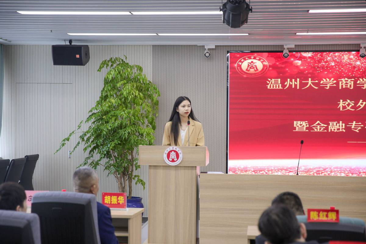 罗建利作为本次会议的主持人,介绍了到场的各位校外导师——温州城市大学党委书记陈红辉、温州给力税务服务中心董事长何建龙、浙江怡联网络科技股份有限公司董事长胡亮、北京源大智库CEO华芝、温州市人大原秘书长林坚强、温州市经济体制委员会原主任马津龙、温州融创孵化器管理有限公司董事长吴小平、温州市金融办副主任余谦、中国中小企业协会副会长周德文、中信证券温州分公司总经理潘晔、瓯海农商银行董事长黄定表、浙江可行财务管理咨询服务有限公司CEO叶豪华、浙江东方纵横认证有限公司董事长蒋利丹、浙江科能企业管理有限公司董事长叶剑淼、温州市供应链学会会长黄小明、温州市商务局原副局长潘平平、文成农商银行董事长叶为民、温州市人才常委会副秘书长许瓯。