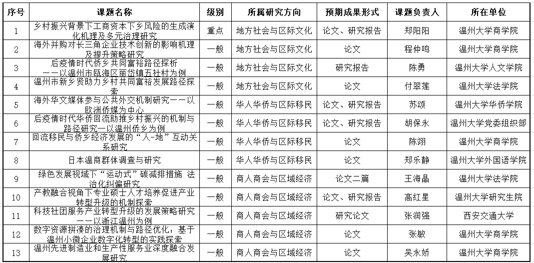 根据《关于温州人经济研究中心2021年度专项自设课题的申报通知》,基地于8月份开始组织课题申报。本次申报共收到申报书32份,经基地组织校内外专家评审,13个课题获得立项。