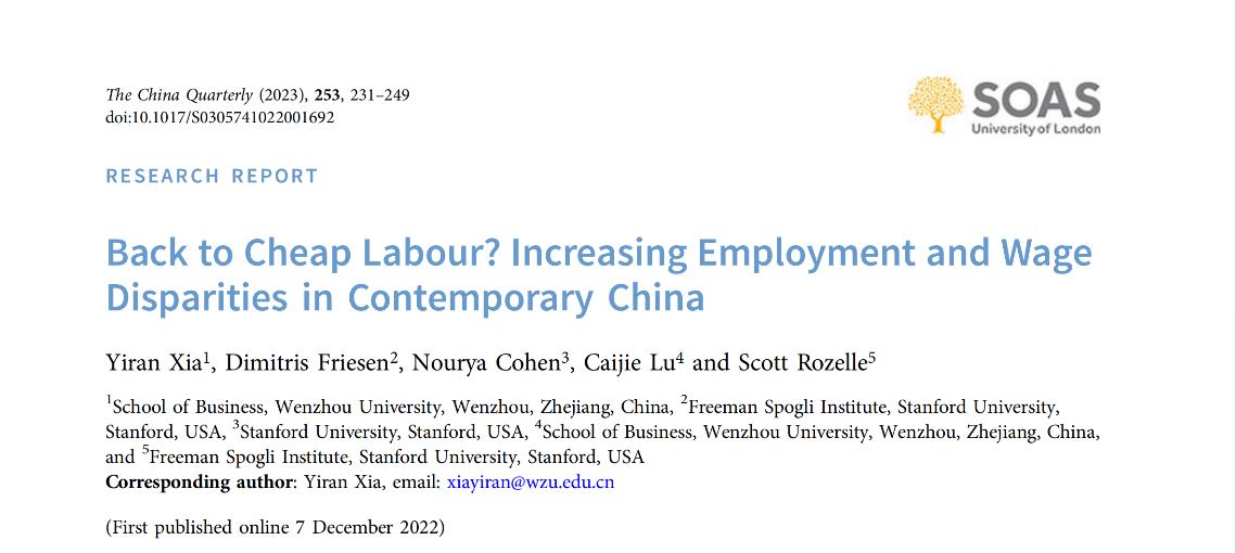 商学院夏怡然教授以第一和通讯作者身份,和斯坦福大学的罗斯高(Scott Rozelle)教授团队合作,在区域与中国研究领域SSCI权威期刊The China Quarterly发表题为《Back to Cheap Labour? Increasing Employment and WageDisparities in Contemporary China》的论文。