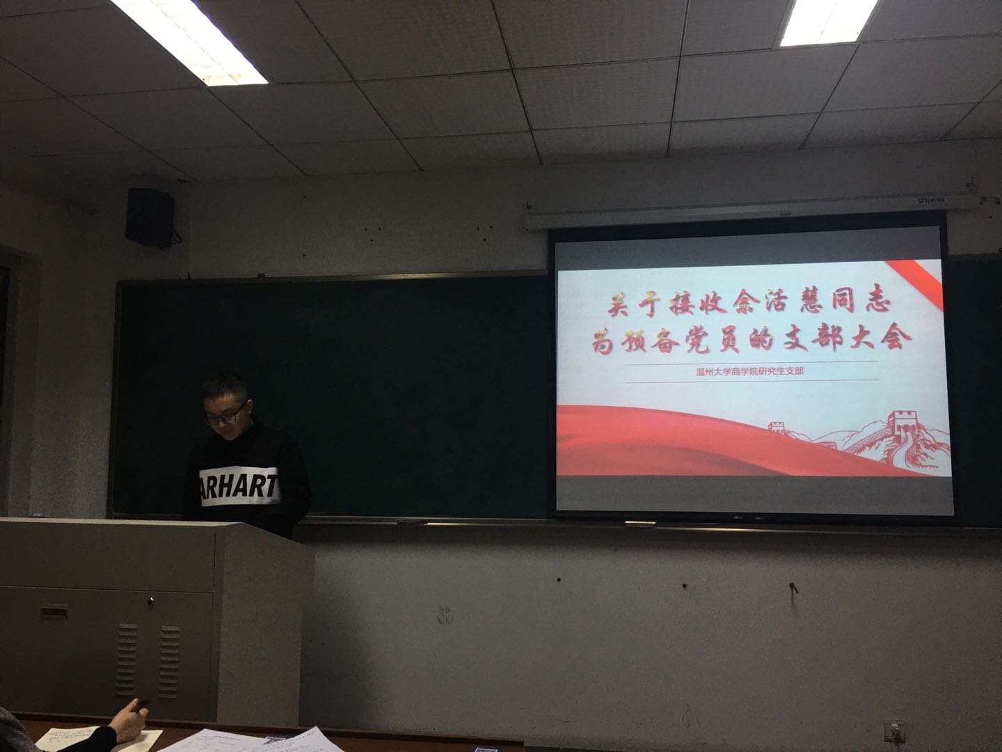 第一项议程,发展对象余活慧同志汇报有关情况。余活慧同志宣读《入党志愿书》,并向党组织汇报了自递交入党申请书以来对党认识的加深、入党动机、本人履历、家庭成员和主要社会关系情况,并表明无其他需向党组织说明的情况。