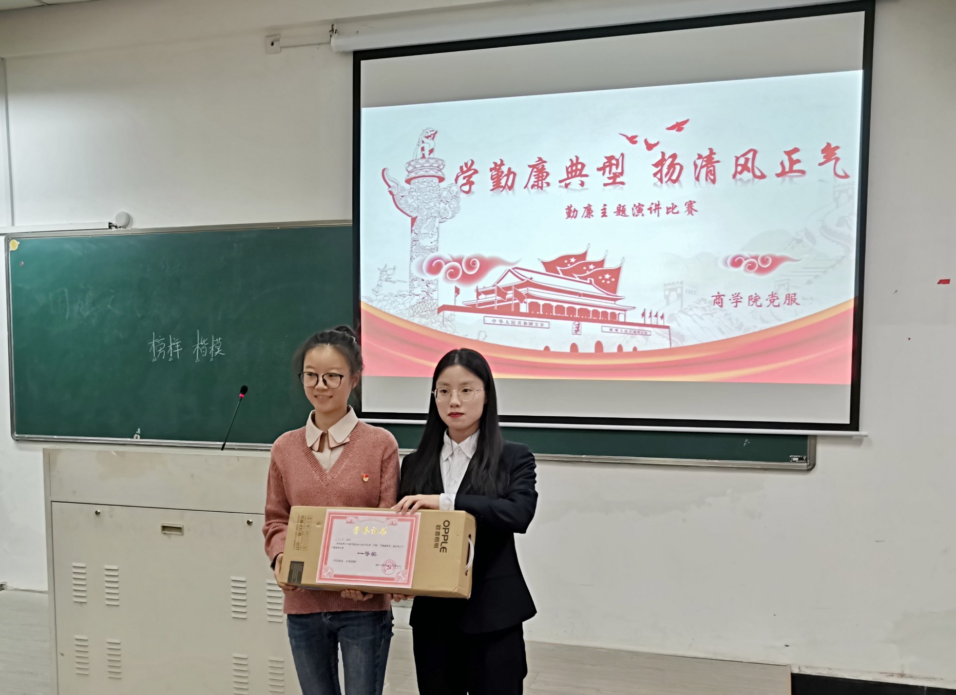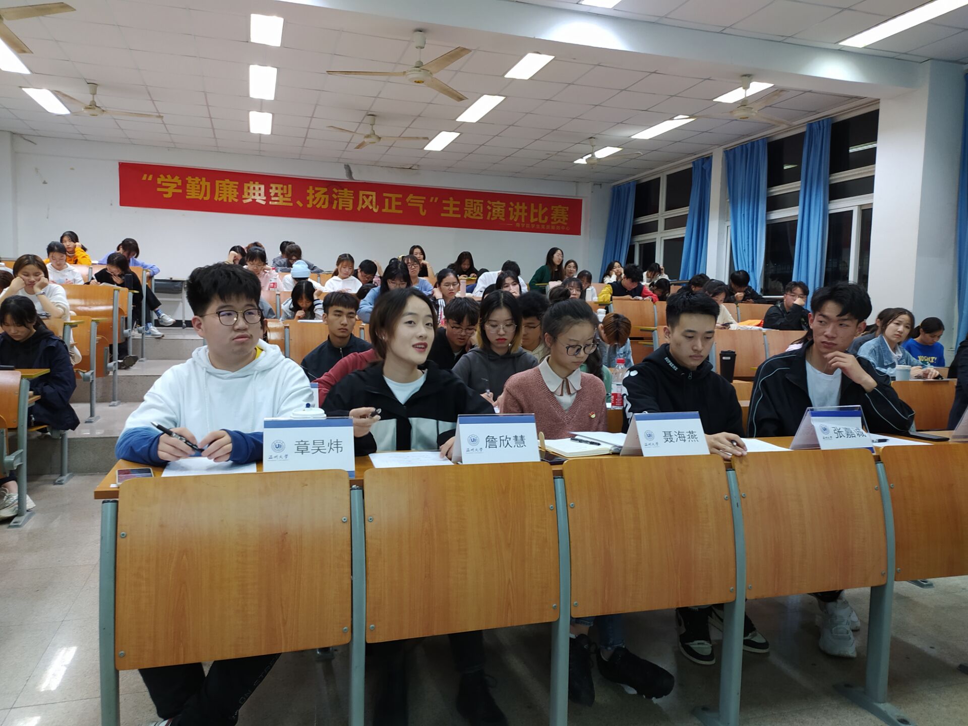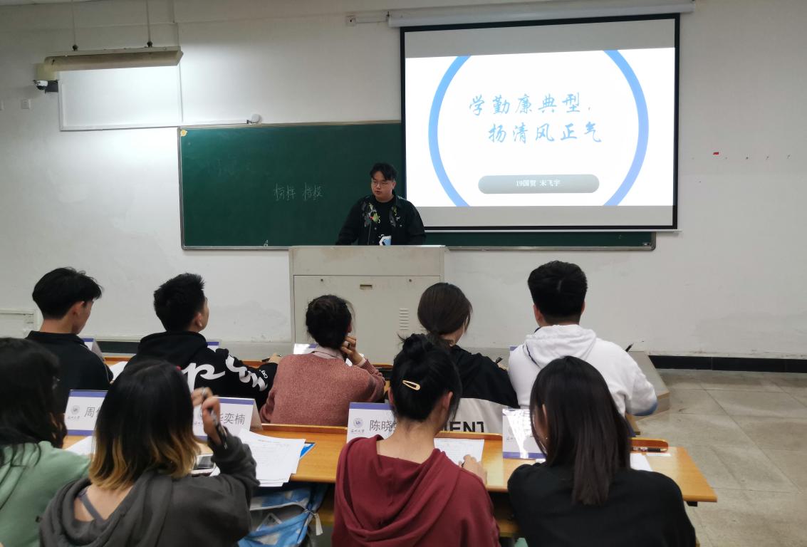 为响应习近平总书记的号召,深入贯彻落实党的十九大精神,强化“重要窗口”使命担当,提升青年学生的思想觉悟,进一步弘扬清廉典范,唱响主旋律,温州大学商学院于2020年11月9日晚在北2-402教室举行了“学勤廉典型,扬清风正气”主题演讲比赛。商学院学生党员服务中心指导老师聂海燕、学生会执行主席张嘉诚、团委副书记武瑞杰、党服中心主任詹欣慧、副主任章昊炜以及中心各部门部长们出席本次活动并担任评委。