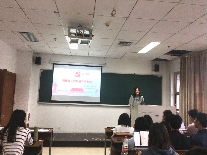 展示完毕后,结合建党一百周年的时代背景,各个积极分子进行了基于党史党章的理论知识问答,期间详细回答了中国共产党的性质﹑社会主义初级阶段基本路线﹑何为“不忘初心,牢记使命”﹑革命时期形成的伟大精神以及“十四五”时期以及“四个全面”理论的变化与缘由等一系列问题,全方位展现了扎实的理论基础,彰显了饱满的学习热情。而后,结合答辩内容与民主座谈情况,与会党员对积极分子展开提问,在党员和积极分子的互动中,进一步深化了对各积极分子的认识与了解。其中,入党积极分子陈剑阐述了自己对社会主义制度优越性的理解,认为强效有力的疫情防控、全面铺开的疫苗接种以及蓬勃向上的国家经济均生动诠释社会主义制度的优越性,充分展示了中国人民的精神,格外彰显中国共产党的先进性。积极分子夏禹结合自身学生干部经历,回答了如何在专业学习与学生工作中形成良性互动,以及如何充分发挥学生党员的模范带头作用。