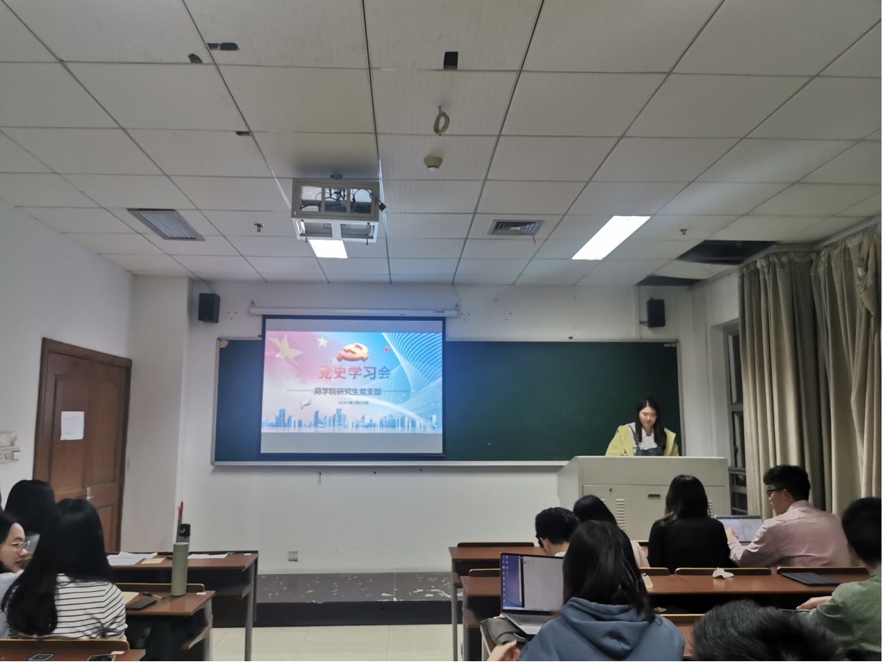 2021年4月26日晚,商学院研究生党支部线下召开了拟发展对象答辩会,本次会议共10名积极分子参加答辩。支部书记韩新华老师及26名正式党员、6名预备党员参加本次大会,会议由支部组织委员陈丹女同志主持,共设三个环节。