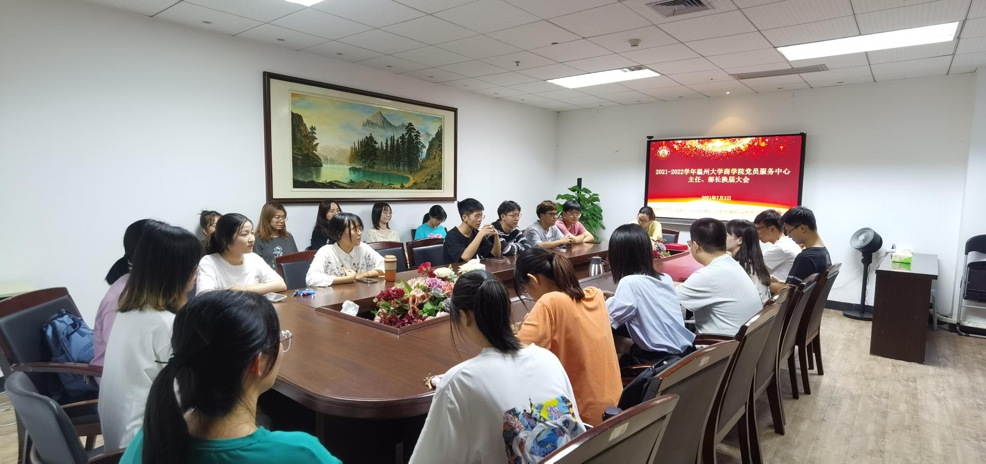 为提高学院学生党服中心成员的凝聚力,更好开展党建工作,温州大学商学院学生党员服务中心于2021年7月2日晚在商院楼A222会议室顺利举办了2021-2022学年温州大学商学院学生党员服务中心主任、部长换届大会。学院学生科科长周洁文、学生党员服务中心指导老师聂海燕以及中心全体成员出席本次会议。