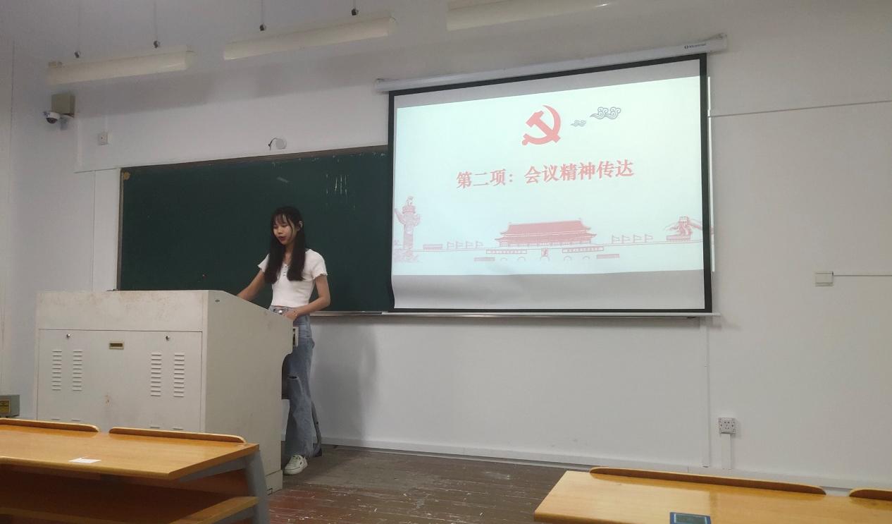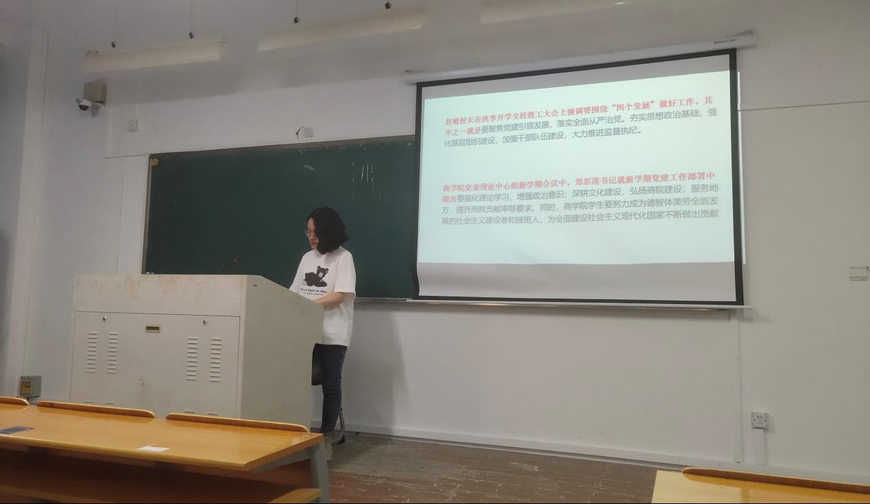 第二项议程,宣传委员徐丽媛传达学院党委理论中心组新学期的会议精神。会上提到,学院党委郑彩莲书记结合2021年秋季教工大会上校党委书记谢树华和校长赵敏的讲话精神,就新学期商学院党建工作部署提出要强化理论学习,增强政治意识;深耕文化建设,弘扬商院建设等要求。同时流露出商学院学生要努力成为德智体美劳全面发展的社会主义建设者和接班人、为全面建设社会主义现代化国家不断做出贡献的殷切期盼。