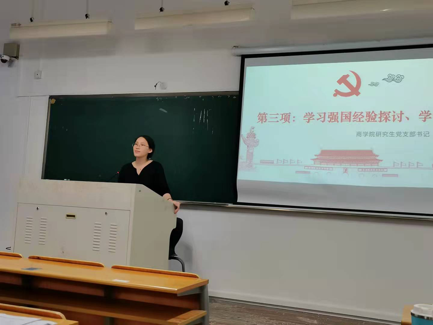 第三项议程,支部书记韩新华就学习强国进行经验的探讨和学习,并总结了过去一学年的党支部情况。会上,韩新华老师表扬了程晓丽同志上一学期金融宣讲团的相关活动,鼓励全体党员向其看齐,在防疫、校园安全等方面发挥党员先锋模范作用。同时,提出各位党员要有主动自觉学习时事政治的热情,用理论学习武装自己的头脑,在每一次支部大会和党小组的学习上都应准备支部学习记录本进行书面心得的记录,不断提高自身综合素质。最后,韩老师倡议每一位商学院研究生党支部成员都应积极向支委建言献策,助力打造支部品牌,努力让商学院研究生党支部成为特色党支部、标杆党支部。