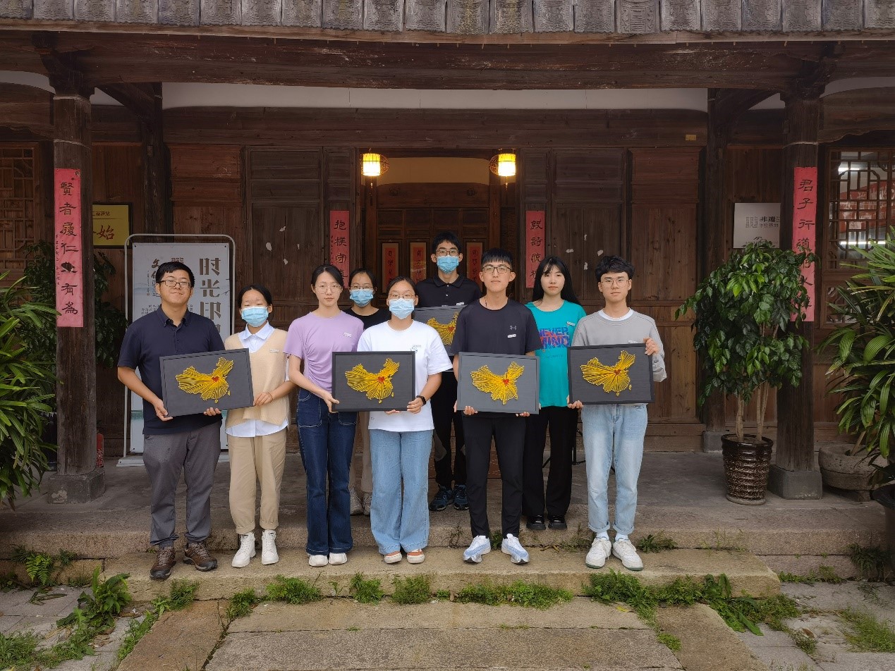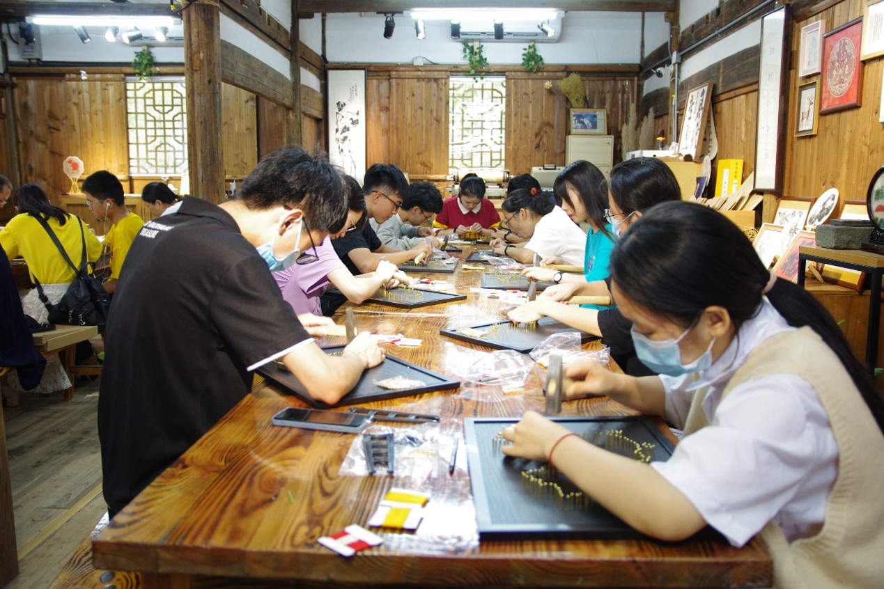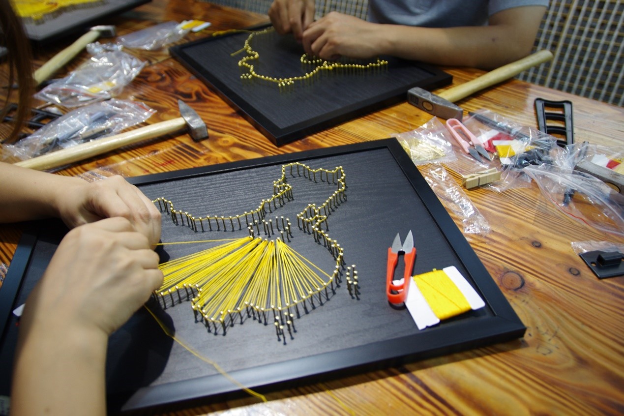 本次的参观体验中,青年党员们参观了活字印刷、丝网印刷、古法造纸、扎染、凸板印刷、雕版印刷、古法装帧等传统工艺项目,又进一步观看学习了弦丝画的制作视频,深入了解弦丝画的制作过程,更是亲自动手现场体验。在现场老师的指导下,青年党员们一个个亲自动手拿着钉子拿着锤子,一锤一锤的构建出中国的版图。一根根金色的丝线一抻一拉,渲染出了一个金色的中国。首都的位置用红线勾勒出一个鲜红的爱心,这不仅仅是代表着首都的位置,更彰显着青年党员们对祖国炽热的爱。