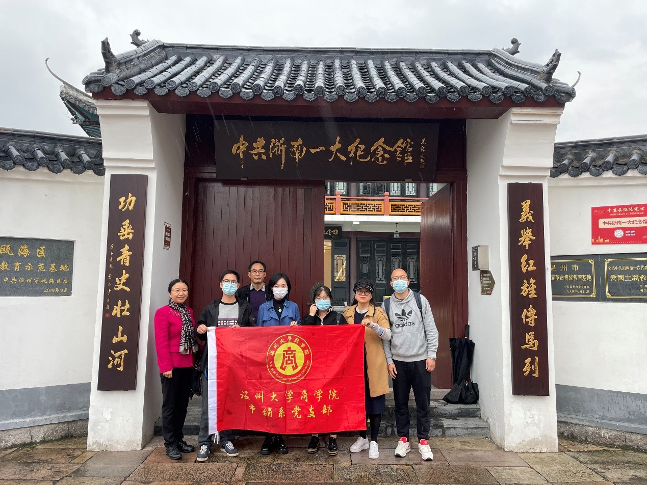 11月17日下午,商学院教工第三党支部全体成员一起赴瑞安玉海楼和瓯海渔谭浙南一大会址参观学习并开展党史教育活动,活动还邀请了工商系部分党外代表。支部全体成员在龚军姣书记的带领下,参观了浙江四大藏书楼之一的玉海楼。玉海楼是一座具有特殊意义的私家藏书楼,包含了孙诒让故居和百晋陶斋,1997年被命名为浙江省爱国主义教育基地。以孙衣言、孙锵鸣、孙诒让为代表的文化精英在当时积极投身兴儒救国,在寻求富国强民道路的实践过程中,将永嘉学派的经世之学传承发展,以达到“振世救敝”和“富强之原,在于兴学”的改良目的。之后,大家赴瓯海渔谭浙南一大会址参观学习,追寻那段红色记忆,重温那些红色往事,缅怀革命先烈的丰功伟绩。浙南一大在渔潭召开,这是浙南党史中的一件大事,在浙南党史中占有重要地位。浙南特委成立后在党中央直接领导下,重点领导武装斗争,积极进行建党和发动群众工作,开展土地革命,筹建红色政权,在浙南人民心中播下了革命火种,为后来浙南游击根据地的建立奠定了基础。