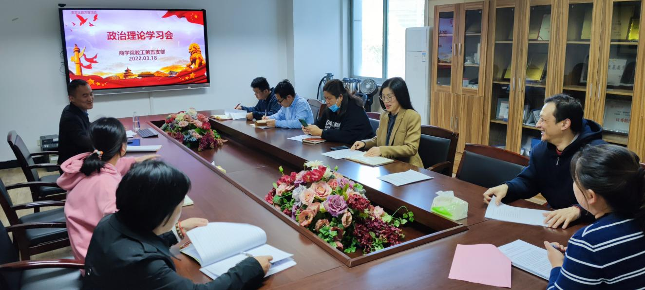 2022年3月18日下午,商学院教工第五党支部在商学院A222会议室召开了支部全体党员政治理论学习会。