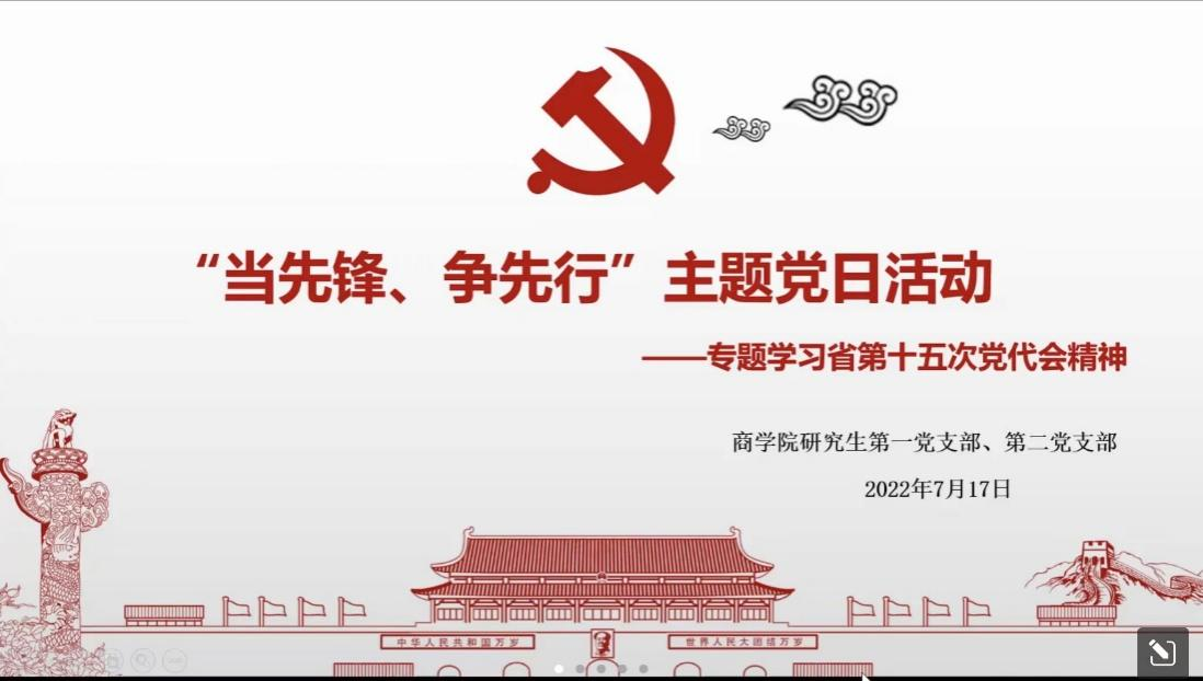 2022年7月17日,为深入学习贯彻省第十五次党代会精神,把思想和行动统一到省党代会精神上来,进一步激发动力、理清思路、明确路径,商学院研究生第一、二党支部于线上开展了主题为“当先锋、争先行”的集中专题学习活动。会议由研究生第一党支部副书记陈维奇同志主持。两个研究生支部共52名党员参加会议。