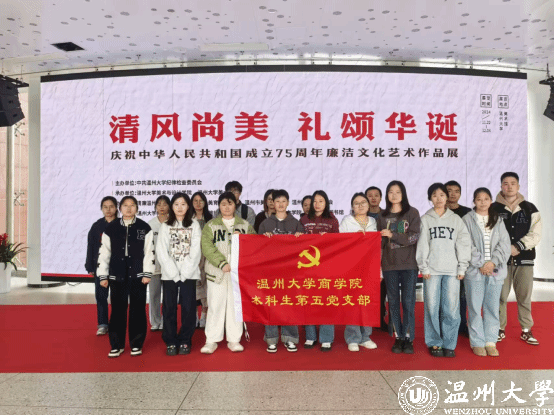 为深化党员对廉洁文化的认识,强化廉洁自律意识,12月4日,温州大学商学院本科生第一、二、三、四、五党支部及研究生第一、二党支部特组织各支部学生党员、入党积极分子前往温州大学北校区美术馆参观“清风尚美 礼颂华诞——庆祝中华人民共和国成立75周年廉洁文化艺术作品展”。