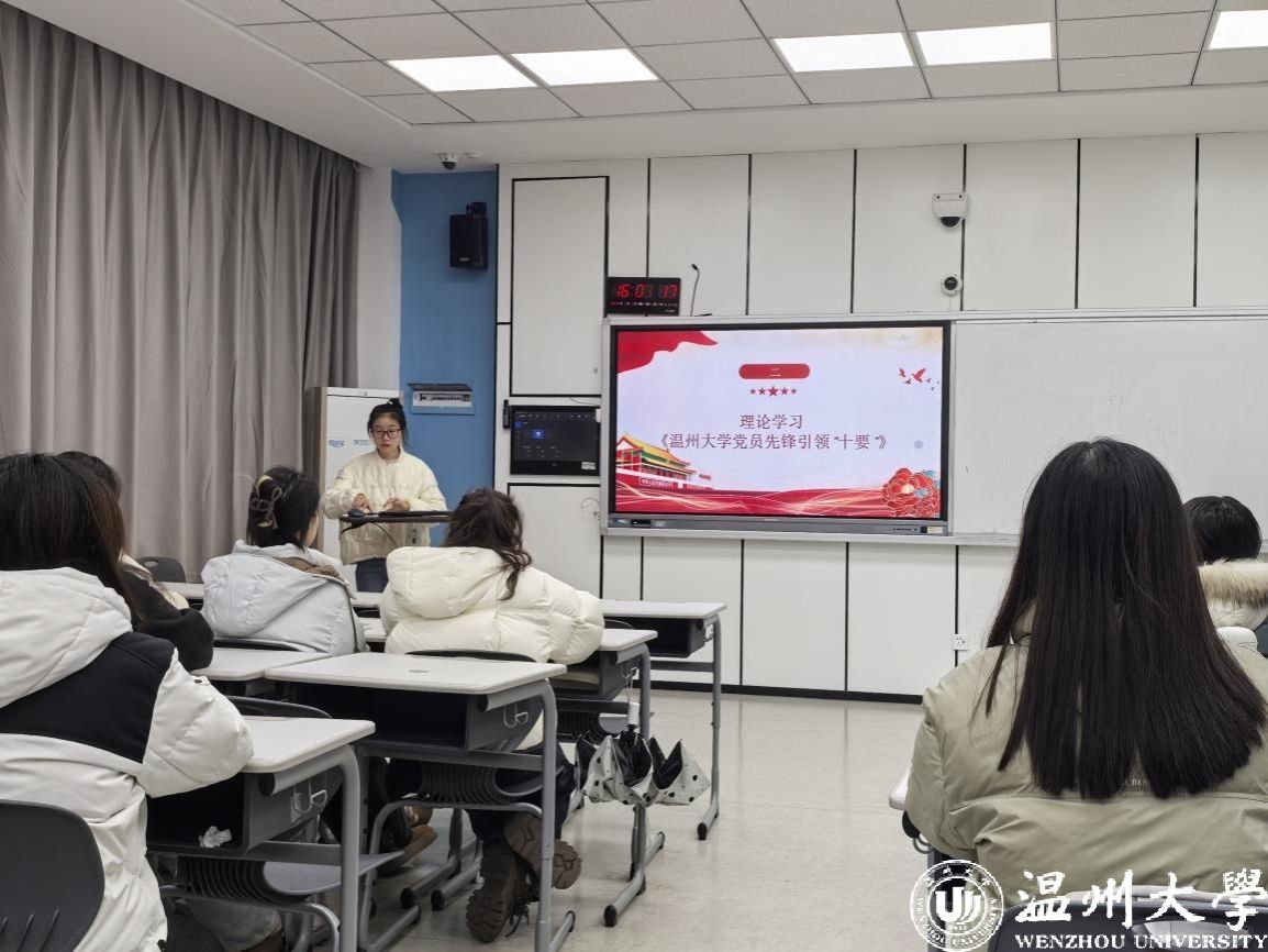 随后,支部书记聂海燕领学《温州大学党员先锋引领“十要”》,进一步明确学生党员的责任和使命,讨论践行学生党员“五个带头”的路径。她强调,作为党员不仅要在思想上与党中央保持高度一致,更要在行动上发挥先锋模范作用,以实际行动践行党的宗旨。