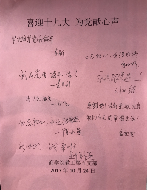 随着中国共产党第十九次全国代表大会的顺利闭幕,2017年10月24日下午,商学院教工党员第五支部举行“十九大”报告专题学习会,院党总支书记郑彩莲、院党总支副书记刘开练、支部党员参加本次学习会。
