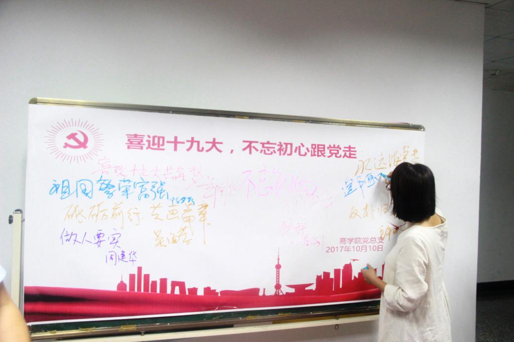 商学院的教职工党员们通过这种方式表达了对党的十九大召开的喜悦心情和对国家繁荣昌盛的美好祝愿。大家纷纷表示将从自身做起,勤勉工作、开拓进取、奋发有为,把对伟大祖国的热爱转化为推动学院学校十三五建设的磅礴力量,凝聚爱国情、共筑中国梦,以优异的成绩迎接党的十九大胜利召开。