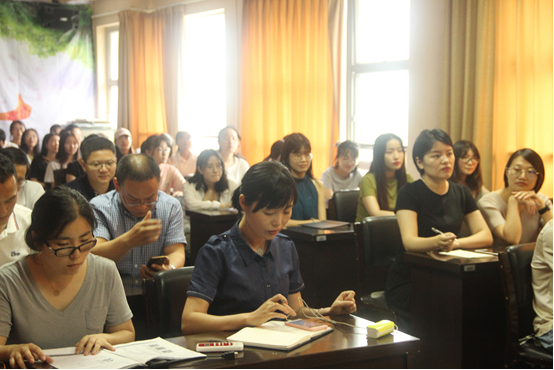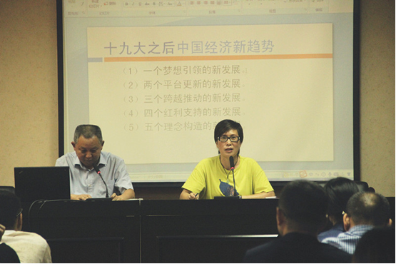 随后,进行了“学习新思想,师生同上一堂课”的集中学习活动。主讲人商学院院长、党总支副书记胡振华教授围绕“十九大后的中国经济”为在场师生党员上了生动的一课,他分别从“一个梦想引领的新发展”、“二个平台更新的新发展”、“三个跨越推动的新发展”、“四个红利支持的新发展”、“五个理念构造的新发展”等五方面展开分析我国经济当下局势,总结了十九大之后新中国经济新形势。“一个梦想引领”是中华民族伟大复兴的中国梦通过两个百年目标和三个阶段得到实现,这是未来发展的基本底线。“两个平台更新”,胡院长从国内与国外两大角度提出“升级版”概念。“三个跨越推动”是跨国经营、跨界融合和跨所有制的统称。“四个红利支持”,胡院长将其总结为人口质量红利、全面改革红利、深度开放红利以及万众创新红利。“五个理念构造”则为创新、协调、绿色、开放和共享五大发展理念。