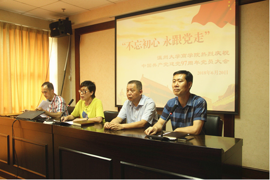 在中国共产党即将迎来建党97周年的重要日子里,商学院全体师生党员于2018年6月20日下午两点集聚商学院楼A301室,隆重召开以“不忘初心,永跟党走”为主题的党员大会,迎接党的生日,意义深远。学院全体师生党员出席了本次会议。会议由党总支书记郑彩莲主持。