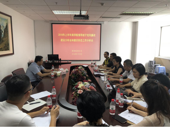 2018年7月9日下午,我院党总支在商学院楼A222召开2018年上半年党风廉政建设和意识形态分析会。院党总支书记郑彩莲、院长胡振华、、党总支宣传委员白延虎、国教部支部书记吴海蓉、学生会主席斯琳晓等及师生代表出席了本次会议。联系商学院的校领导薛伟副校长全程参加了会议。会议由院党总支书记郑彩莲主持。
