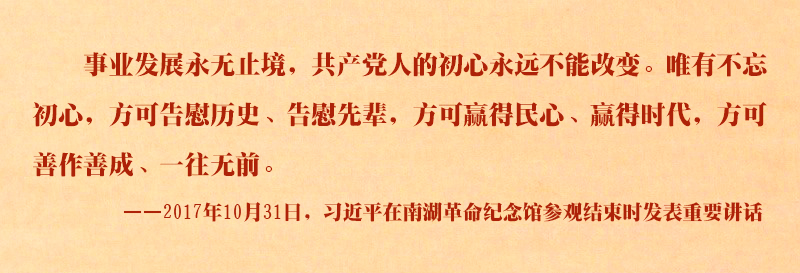 2017年10月31日,习近平带领新一届中央政治局常委瞻仰党的一大会址和浙江嘉兴南湖红船,回顾建党历史,重温入党誓词,宣示新一届党中央领导集体的坚定政治信念。初心之旅一年间,习近平多次提到共产党人的初心,号召广大党员干部不忘初心、牢记使命、永远奋斗。