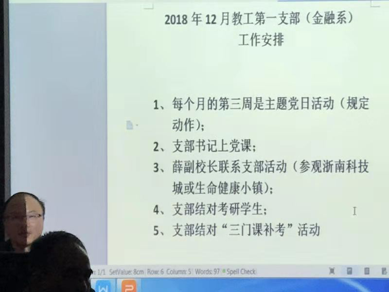 同时,支部还安排了12月份的支部活动,具体包括:每个月的第三周是主题党日活动(规定动作);参加校领导薛副校长联系支部活动,参观浙南科技城或生命健康小镇);支部结对考研学生;支部结对“三门课补考”活动和重点学习《中国共产党支部工作条例(试行)》。