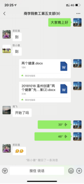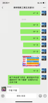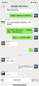 支部书记黄兴利事先在微信群里做了预告,晚上8点准时发出本次学习资料: “两个健康”,由支部书记黄兴利对“两个健康”做了背景介绍,由组织委员周飞对“温州市创建新时代“两个健康” 发展先行区总体方案”做解读,由宣传委员陈小曼对“温州市创建新时代“两个健康”先行区动员大会和首届中国(温州)新时代“两个健康”论坛”做精神指导。并设置了在线抢答,支部书记出题,党员抢答,热闹非凡。各位党员在群里也纷纷发表自己的观点,面对面的交流变成线上交流,带来了很多新意。