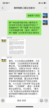 商学院党总支书记郑彩莲评价到:本次活动在方式上“求创新”:党员同志们平时工作时间长,工作强度大,集中学习不便时通过线上学习形式,解决了时间问题,并通过鼓励党员同志发言讲出自己的见解和心得,使党课变成人人参与的大讲堂。在模式上“求主动”:当场就所学知识要点语音出题进行抢答,了解党员学习掌握情况,增加趣味同时又促进了党员之间的交流,让学习教育活动更加深入人心。