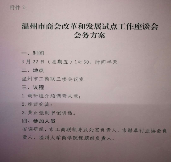 3月22日(星期五)下午,商学院教工第一支部周建华和何宾老师参加省工商联关于温州市商会改革和发展试点工作座谈会,会议由温州市委统战部副部长、市工商联党组书记朱荣娒主持。