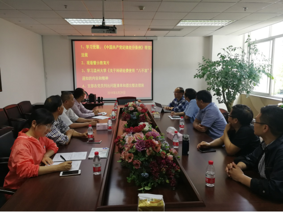 首先,组织党员同志再次学习党章和《中国共产党纪律处分条例》等党内法规中有关警示方面的内容;然后集体观看《利剑巡视》专题教育片,并结合教师的专业特点,认真学习温州大学《关于科研经费使用“八不准”》通知的内容和精神;最后各党员同志从自身情况出发,重点从政治建设、纪律规矩、作风建设、清正廉洁等4个方面查找差距和问题,提出下一步的整改措施和整改期限。