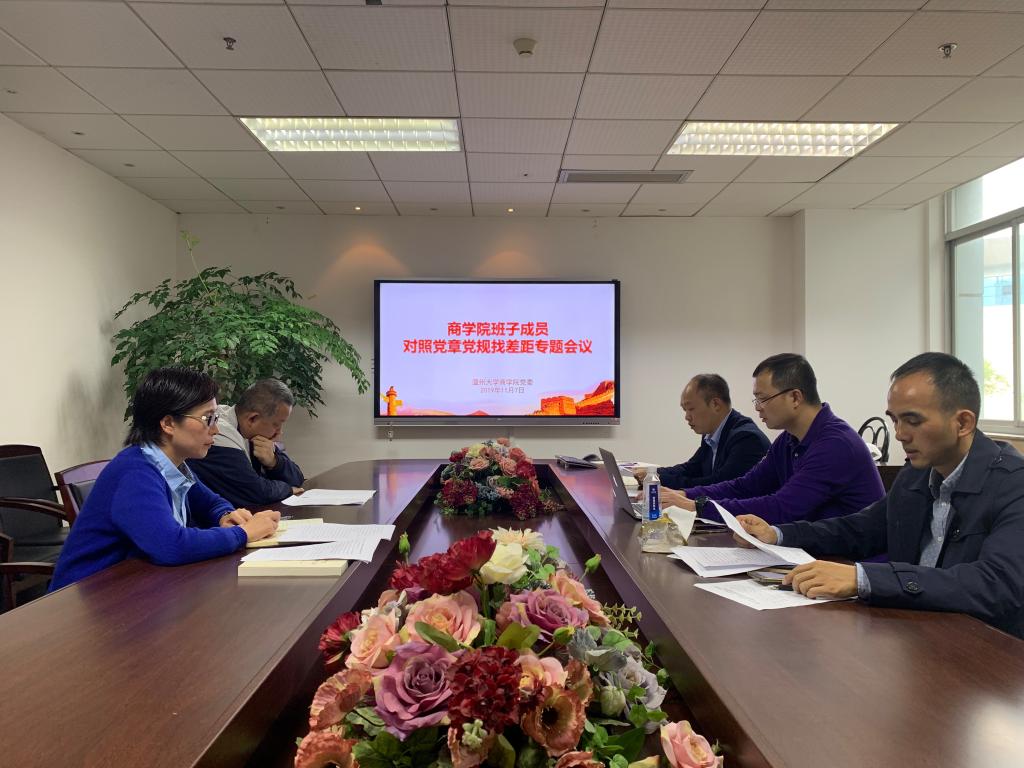11月7日下午,商学院党委召开班子成员对照党章党规找差距专题会议。院党委书记郑彩莲、院长胡振华、副书记唐华、副院长罗建利等出席会议,副院长余向前列席会议。