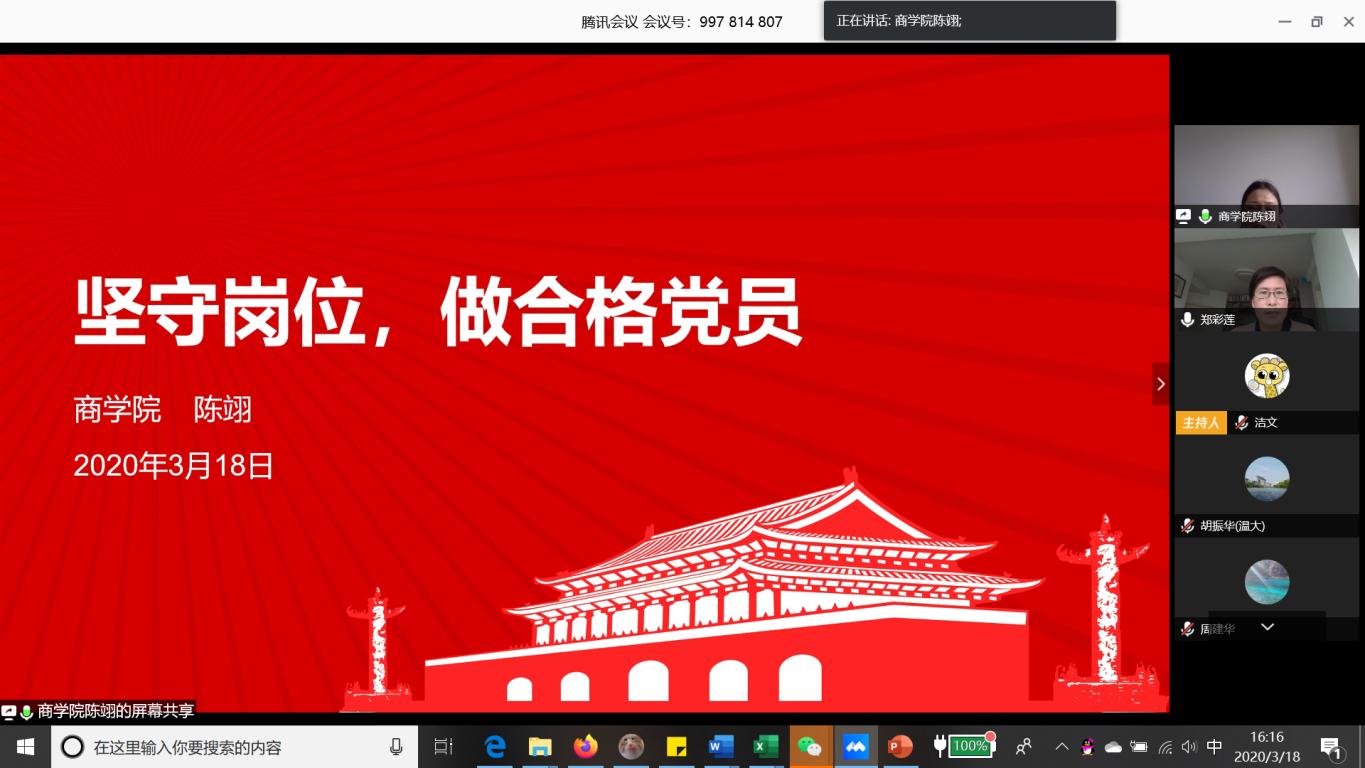 会议还以“抗疫情 促发展 当先锋”之——“线上教学与党员先锋模范作用的发挥”为主题,邀请教工第六支部支部书记陈翊老师作了专题分享。陈翊老师在疫情期间保障留学生“停课不停学”的事迹在不久前被人民日报海外版、今日头条等媒体报道,她在分享中讲述了自己如何克服畏难思想,从推翻原有备课内容,重新设计ppt开始,到每天花大量时间录制、修改授课视频,历经艰辛完成跨国给留学生授课任务的故事,她认为:作为一名党员教师,只有在关键时刻全心全意投入工作,守好岗位,完成教师传道授业解惑的本职任务,才能算是一名合格的共产党员。陈翊老师的事迹也引发了与会老师的强烈反响。