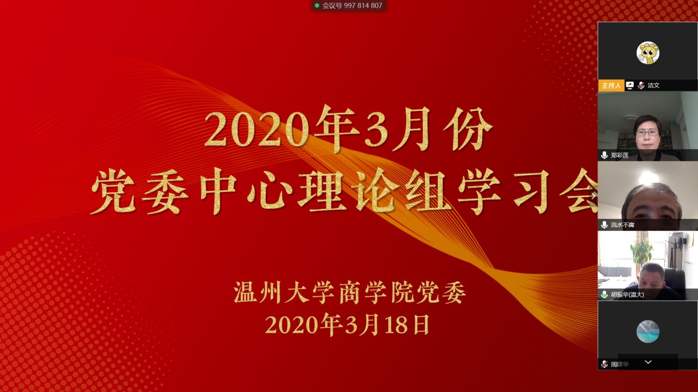 3月18日下午,学院党委书记郑彩莲主持召开2020年3月份党委中心理论组学习会,学习传达校院二级党委会会议精神,并部署落实新学期党建工作重点,就“疫情之下,锚定目标不动摇,促进发展争一流”,做好防控与发展双战双赢工作,统一思想。学院班子成员、党委委员、纪委委员、各支部书记等出席会议。
