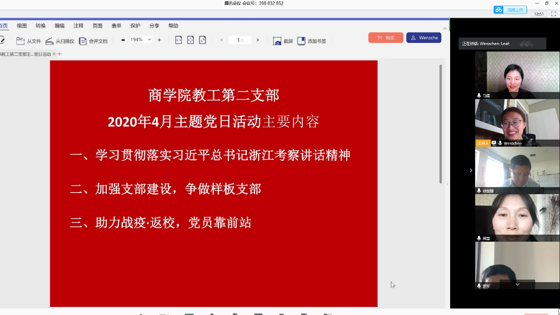 4月28日下午,商学院教工第二支部利用腾讯会议开展了线上主题党日活动。支部8名党员参加会议,会议由支部书记陈文芝老师主持。