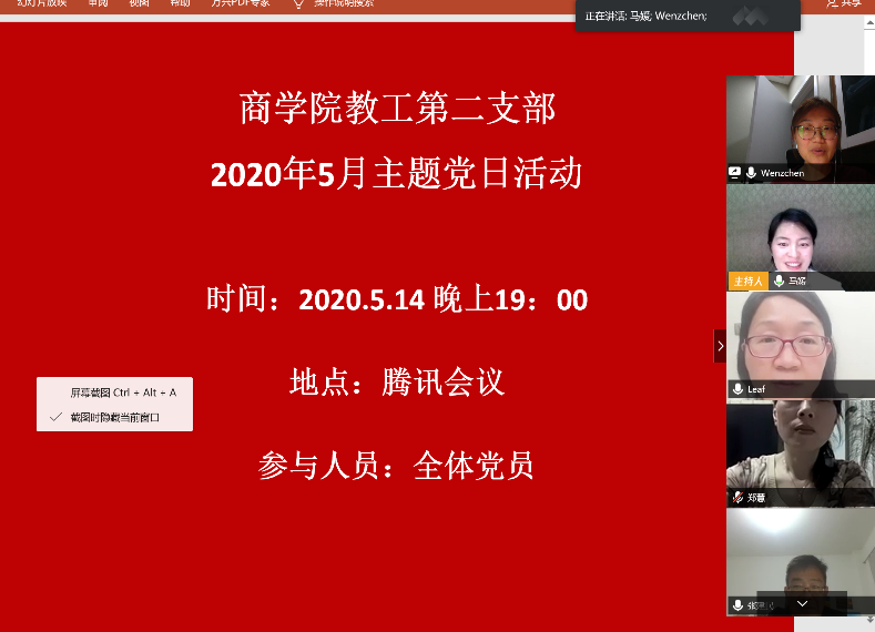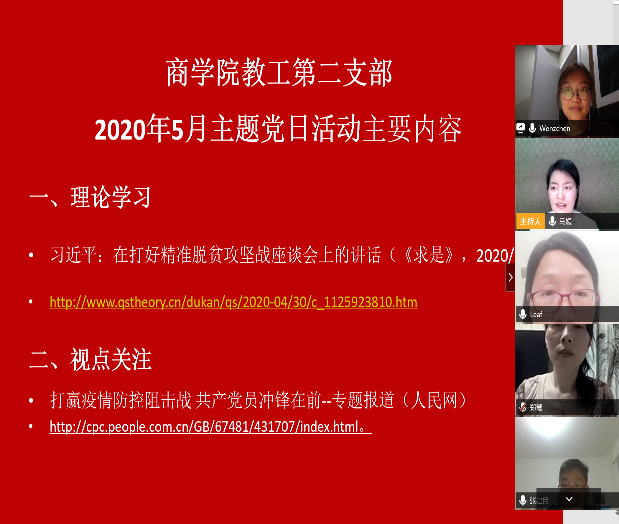 5月14日晚上,商学院教工第二支部利用腾讯会议开展了线上主题党日活动。支部8名党员参加会议,国贸系非党员老师列席了会议,会议由支部书记陈文芝老师主持。此会主题党日活动分为理论学习和视点关注两个方面。