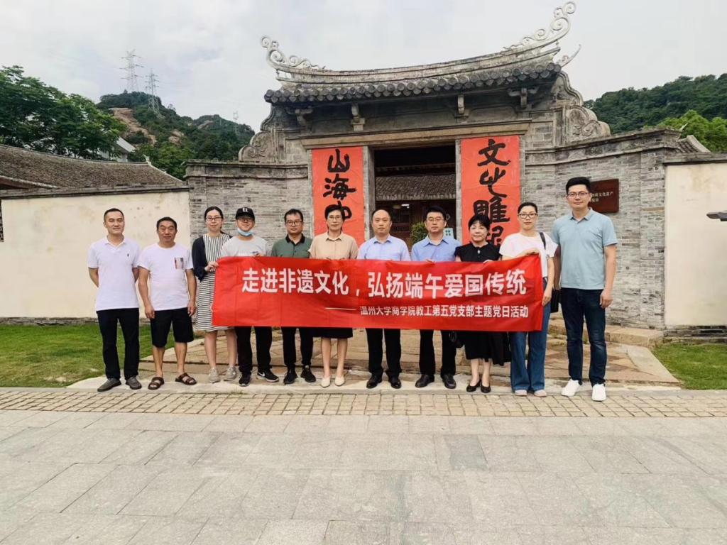 为进一步深入贯彻习近平新时代中国特色社会主义思想,增强文化自信,践行社会主义核心价值观,传承和保护我国优秀传统文化,6月24日温州大学商学院教工第五党支部组织教师党员赴龙湾非物质文化遗产体验馆开展以“走进非遗文化,弘扬端午爱国传统”为主题的党日活动。