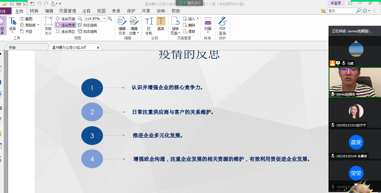 学长首先介绍了他公司的发展历程,分享了公司的企业文化,阐述了公司在疫情中的应对措施和对疫情的反思。