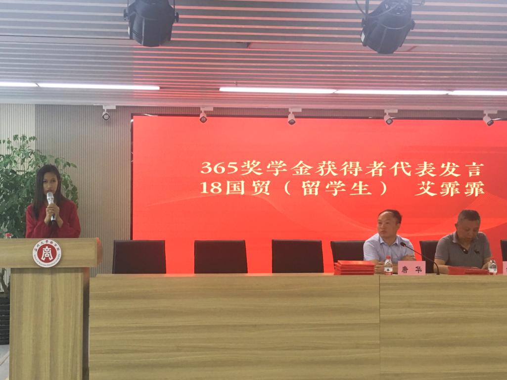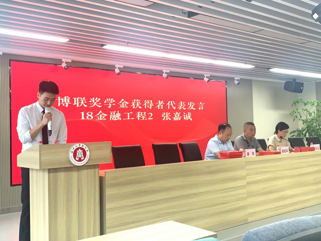 商学院胡振华院长宣读了“博联奖学金”和“365奖学金”获奖名单,共30名同学获奖。其中,“博联奖学金”获奖代表——18金融工程2班张嘉诚、“365奖学金”获奖代表——17市销袁晓辉和18国贸(留学生)艾霏霏先后上台发言,他们在向校友钱旦初先生、徐开晴先生和王仲辉先生致以谢意的同时,更是对商学院给予自己全面发展的平台表示感谢,并表示将继续学习校友勇攀高峰的毅力和精神,“不忘初心”,一路奋勇向前。