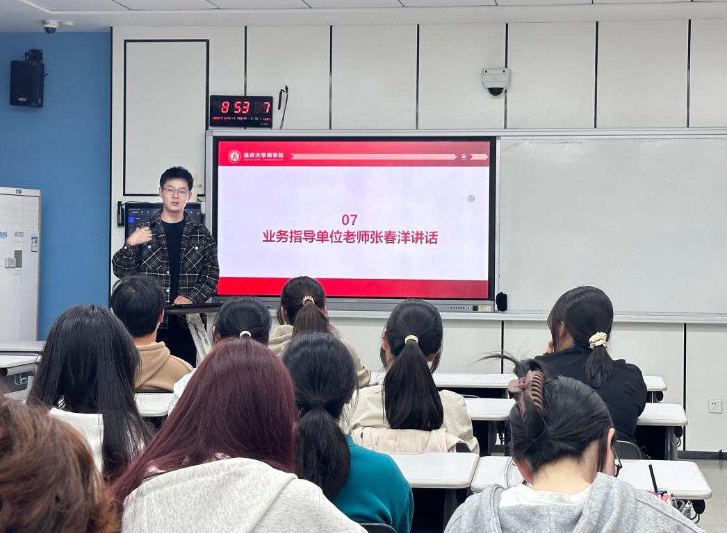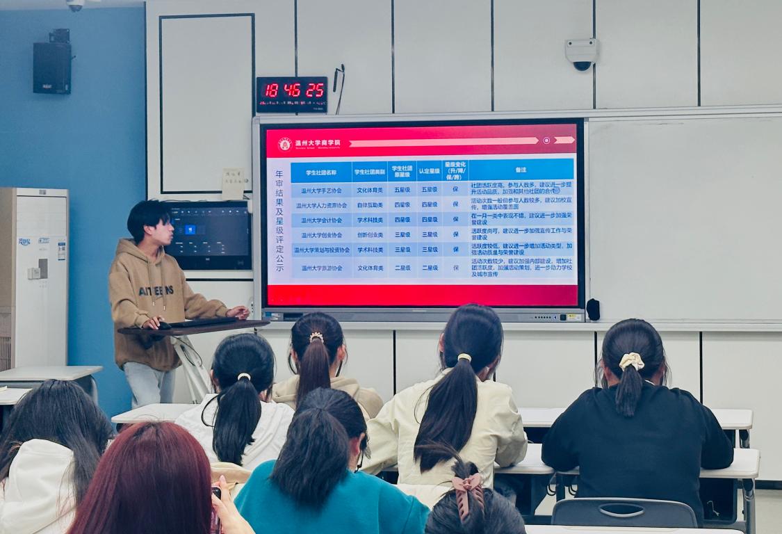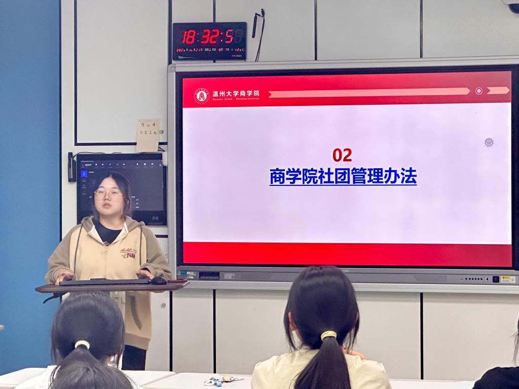 为了更好地健全学生社团工作机制,使各学生社团更有效地开展社团活动进行社团管理,社团部部长杨云彤为各个社团解读了《温州大学商学院挂靠社团管理办法》,使各社团对相关管理办法有了更深刻的认知。