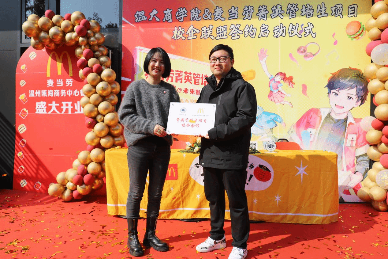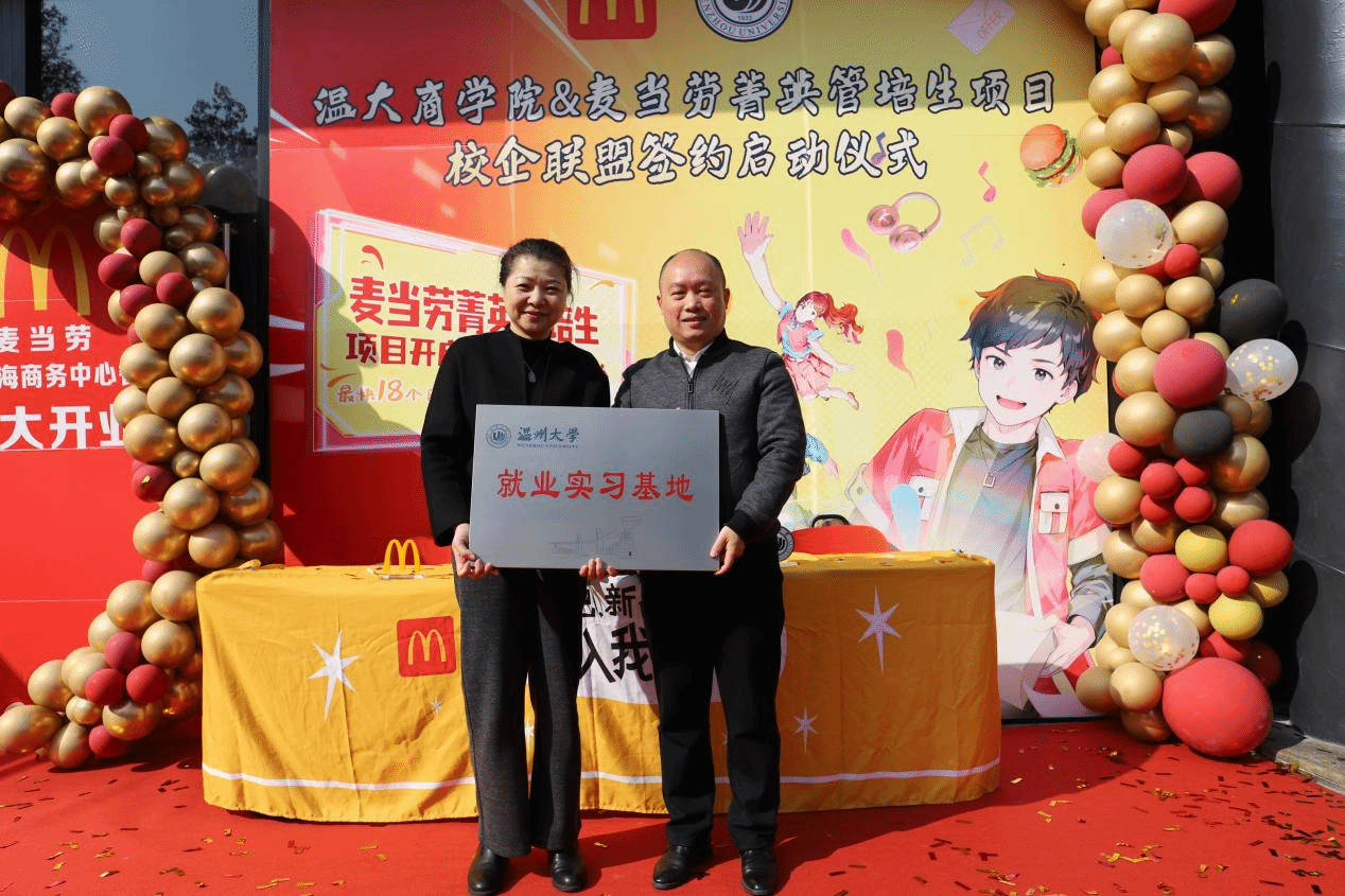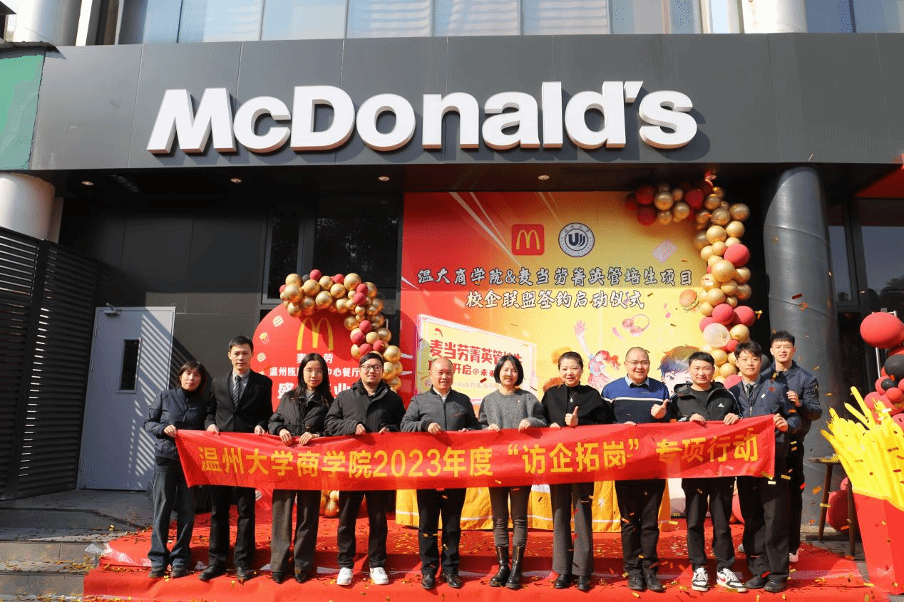 为进一步加强校企合作,深化产教融合,提高人才培养质量。2023年12月21日,温州大学商学院与麦当劳正式举行了校企合作签约暨授牌仪式。学院党委副书记唐华、学院跟岗干部方嘉奇、专任教师李慧慧、辅导员张元祝与麦当劳高管共同参与此次活动。此次合作将为广大学生提供更多实践机会与职业发展平台,培养学生适应未来社会需求的能力。