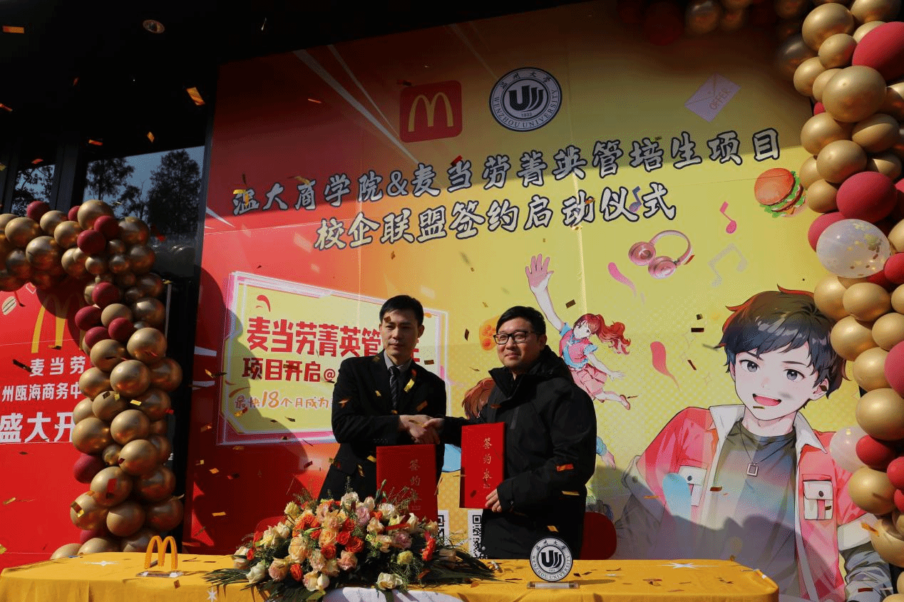 学院跟岗干部方嘉奇与麦当劳高管共同签署了菁英管培生项目的合作协议,这一项目将为优秀的学生提供实习和培训机会,标志着温州大学浙江麦当劳校企合作迈上新的台阶。