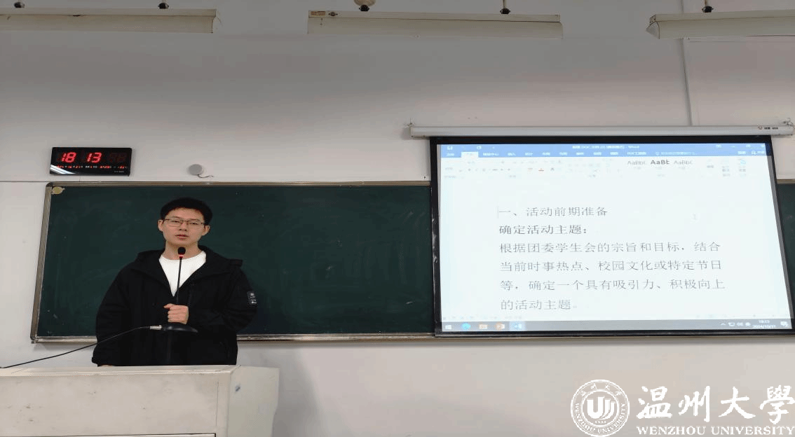 温州大学商学院团委学生会指导老师张春洋老师致辞,张老师以加入团委学生会的目的为角度,为干部们讲述了该如何组织好一场活动。第一:确定主题,撰写以目标为导向,内容精炼、积极向上的策划案并审核。第二:做好活动宣传,通过社交媒体等方式提高活动知名度。第三:准备好物资和设备,提前购买,按要求摆放。第四:活动实施,保障各环节顺利进行。第五:做好活动记录,撰写格式正确内容简练的通讯稿并审核。第六:收尾工作,保护好道具并按指定位置摆放好,指定取还。张老师希望各干部通过在团学学习类似技能,提升自身素质,丰富自身经历,认真学习,让自己成为有能力的综合型人才。