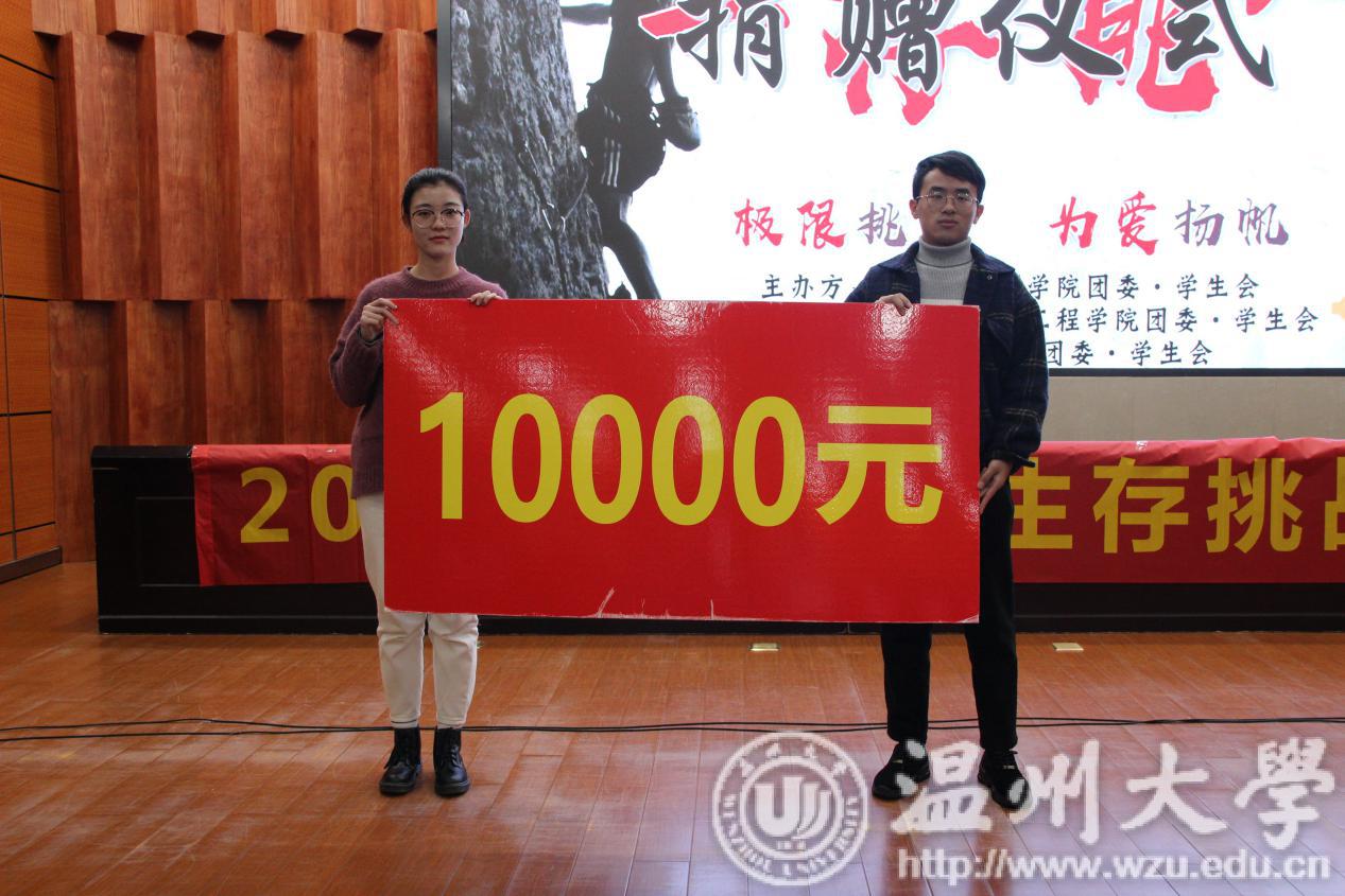 第二项活动为捐赠仪式。商学院组织部部长将生存挑战赛募捐所得交给爱星缘机构的代表崔正强老师。