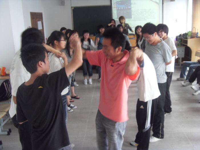 第一个活动是心有千千结。经过心理委员对规则的详细讲诉和ppt上面规则的展示,第一组同学来到场地中央,游戏按照规则展开。经过走乱后拉起手的同学编织了一张错综复杂的网,不过经过大家的齐心协力,他们花了40s解开了这乱结,一个不错的时间。不过第二组的同学有一个更出色的表现,他们的齐心仅用了10s活脱脱将结打开恢复原状。这不仅让他们为自己出色表现鼓掌。